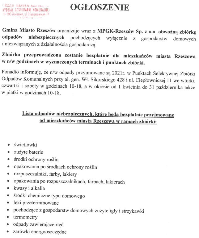 Gmina Miasto Rzeszów wraz z MPGK-Rzeszów w dniach 11-15 listopada 2021 r. organizuje dla mieszkańców obwoźną zbiórkę odpadów niebezpiecznych pochodzących wyłącznie z gospodarstw domowych. Poniżej znajduje się informacja, jakie odpady będą odbierane, terminy i punkty odbioru w trakcie prowadzonej zbiórki.